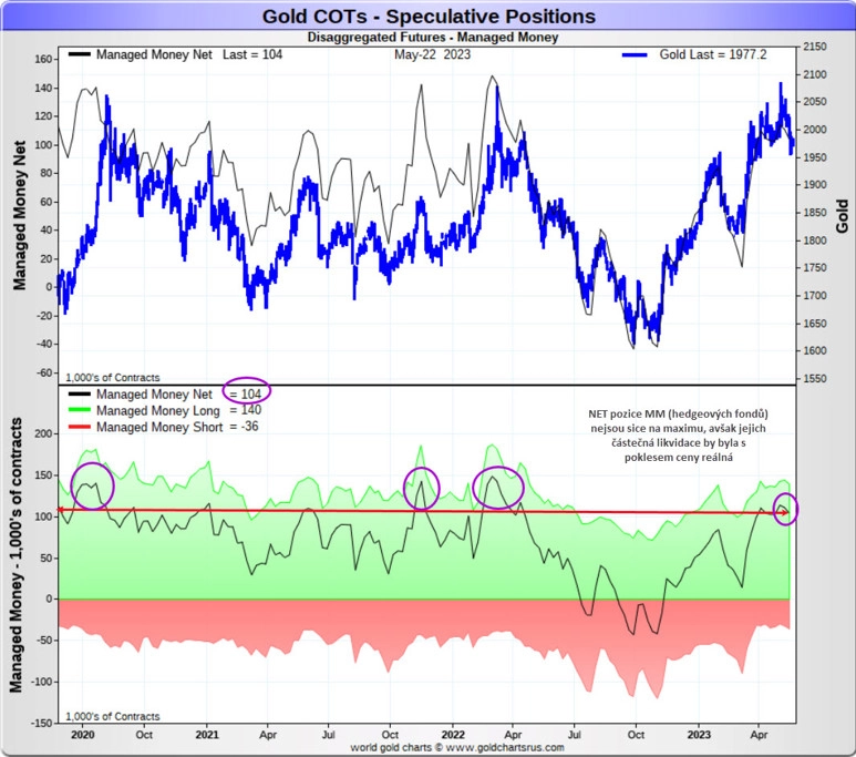 Jaký sentiment vládne na trhu nyní? Určitě bych netvrdil, že investoři oplývají přehnanou euforií, nicméně většina komentářů má tendenci zlato vyzdvihovat a předpovídat mu zářnou budoucnost. Pokud bychom ale měli opět vyznávat kontrariánský postoj, pak mohla cena zlata krátkodobě dosáhnout vrcholu a ústup z historických maxim by byl namístě. Struktura pozic COT je navíc nejvíce medvědí od května 2022, a pokud se komerčním obchodníkům podaří přesvědčit dostatečné množství hedgeových fondů z kategorie Managed Money k tomu, aby opět prodávaly, čekejme další pokles dolarové ceny zlata.