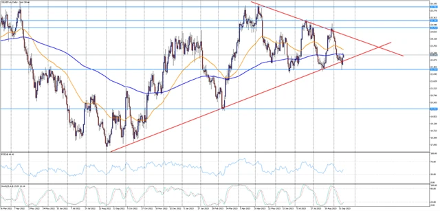Cena stříbra od začátku září spadla o více než 8 %, v srpnu naopak kov zdražil o více než 10 %. Na denním grafu se vytvořila formace trojúhelníku. Rostoucí trendová linie této formace započala v říjnu 2022, vrchol a sestupná trendová linie pak odstartovala v květnu letošního roku na 25,996 USD za unci.