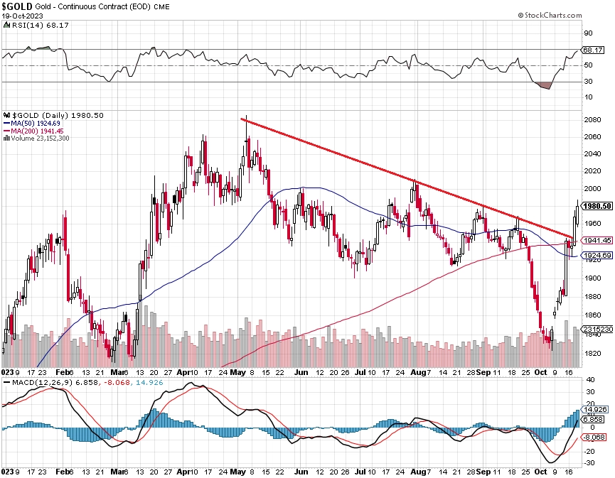 Cena zlata začala rychle růst po teroristickém útoku Hamásu na Izrael a během necelých dvou týdnů prorazila nad linii sestupného trendu z posledních pěti měsíců i nad linii 50% retracementu, tedy vzestupu od minima tohoto pětiměsíčního poklesu.