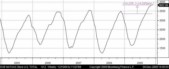Zásoby zemního plynu pokračují v růstu a minulý týden dosáhly 3,837 miliard kubických stop (2 miliard byly evidovány v předchozím týdnu). Nabídka je nyní o 14% vyšší než před rokem a pokud nenastane opravdu tuhá zima, bude jejich výše tlačit na cenu zemního plynu směrem dolů.
