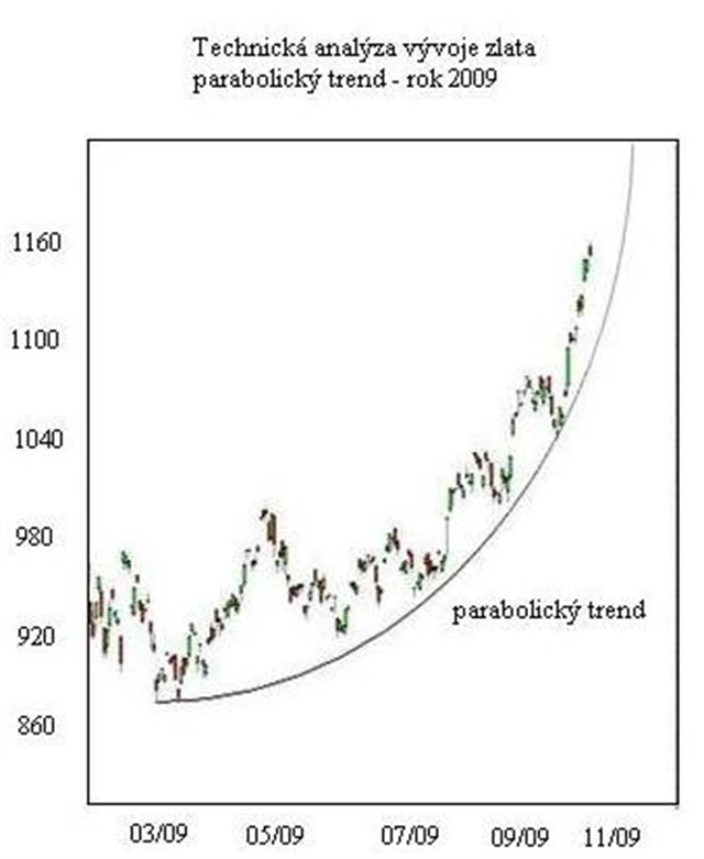 Nicméně v nedávné době se podoba růstu cen zlata změnila. Není to už normální růstový trend, ale vývoj ceny zlata se změnil v něco, čemu se říká v technické analýze parabolický trend.