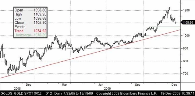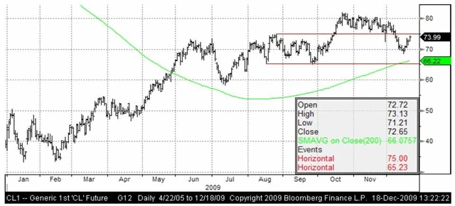 Cena ropy po oznámení stavu amerických zásob našla podporu a začala prudce růst. Výhled na silnější dolar a slabou poptávku pro první čtvrtletí roku 2010 tlačil prozatím na cenu směrem dolů. Ovšem optimistický výhled na zotavení způsobil, že ropa má za sebou nejlepší týden od poloviny října. Support se objevil pod hranicí 70 USD a úroveň 75 USD zatím tvoří rezistenci. Tento týden expiruje lednový kontrakt a obchodovat se tak začne únorový.
