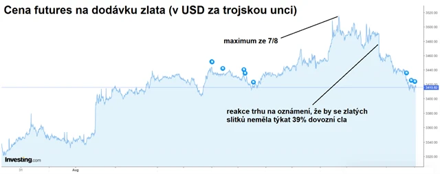 Trh reagoval okamžitě. Cena futures na dodávky zlata v USA vystoupala v pátek intradenně až na rekordních 3 534 USD za trojskou unci. Přispěly k tomu také obavy ze širší obchodní eskalace poté, co USA den předtím uvalily 39% clo na vybrané švýcarské zboží. Švýcarsko si totiž nevyjednalo s USA obchodní dohodu a Washington vůči zemi postupoval poměrně tvrdě. O víkendu ale z Bílého domu zaznělo, že se chystá výkonné nařízení, které má omyl napravit (v pondělí Donald Trump potvrdil, že se zlata cla nebudou týkat), a cena futures rychle klesla o zhruba dvě procenta. Na spotovém trhu se víkendový výkyv neprojevil, pondělí dopoledne naopak dolarová cena unce klesala o více než procento.