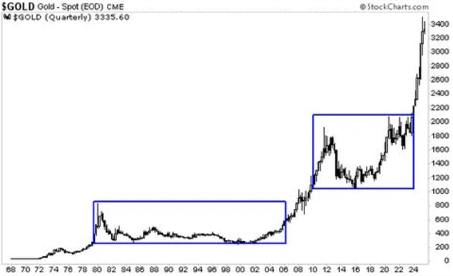 "Investoři vnímají zlato jistě mnoha různými způsoby, jedním z nejpodstatnějších je ale to, že kov historicky dokáže uchovávat kupní sílu vložených peněz. Centrální banky v čele s tou americkou už více než sto let znehodnocují měny, jak je zrovna potřeba. A ačkoli i cena zlata historicky třeba i dlouhé roky stagnuje, následné růsty tato období vyvažují," podotýká Graham Summers, investiční stratég z Phoenix Capital Research. V 70. letech dolarová cena zlata narostla asi o 2 000 %, na přelomu tisíciletí pak asi o 500 %. A vždy šlo o reakci na nějakou významnou ekonomickou nejistotu a oslabení měny.