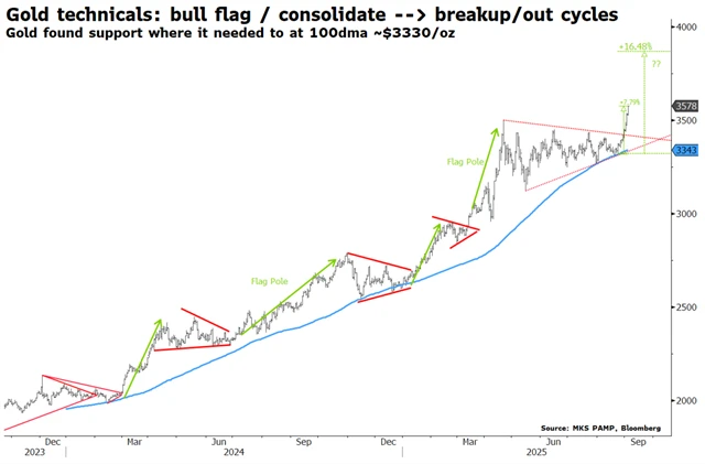 - Očekávání snižování úrokových sazeb a problém s dluhem. Investoři počítají s blížícím se snížením sazeb Fedu, což tradičně zvyšuje atraktivitu zlata. S nižšími sazbami obecně spojovaný předpokládaný pokles výnosů dluhopisů americké vlády znamená jejich menší relativní atraktivitu ve srování se zlatem. V době hlubokých deficitů federálního rozpočtu USA je sice naopak tlak na vyšší výnosy amerických bondů, nicméně obava ze ztráty hodnoty peněz (dolarů) a potenciálně vyšší inflace jsou opět argumentem pro nákupy zlata.