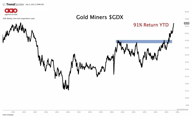 A nakonec něco pro akciové investory. Ti mají velice jednoduchou možnost, jak "hrát" trh se zlatem. Jsou jí akcie producentů kovu, které sleduje mimo jiné ETF s tickerem GDX. Ten patří letos k růstovým hvězdám amerického trhu se zhodnocením přes 90 %.