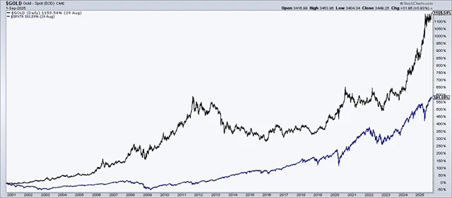 Cena zlata v tomto týdnu opět stoupla na nová maxima, a to nejen v amerických dolarech, ale i v dalších měnách. Část investorů preferuje tradiční bezpečný přístav v době, kdy neustupují geopolitická rizika, centrální banky dále nakupují kov a ve svých bilancích jím částečně nahrazují americké dolary a také trvají obavy z možného nového nárůstu inflace v důsledku celkově výrazně vyššího celního zatížení mezinárodního obchodu. Byla by přitom chyba zlato v rámci investičního portfolia chápat jako protiklad k akciím.