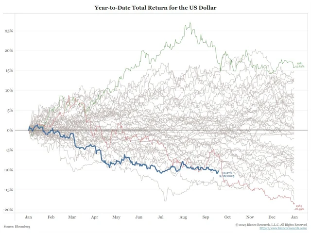 Důvodem je zmíněné oslabování dolaru. Na začátku jara světovým finančním trhům dominovalo heslo "Sell America", které se týkalo dolaru, dluhopisů i akcií. Ale zatímco u bondů a akcií se propad cen zastavil, případně otočil v růst, měna USA dále ztrácí. A to tak, že od začátku roku v obdobném srovnání posledních pěti dekád jde aktuálně o třetí nejslabší vývoj pro americký dolar (méně příznivé byly pouze roky 1972 a 1981, křivka letošního vývoje může brzy narazit ještě na tu z roku 1985, kdy dolar zaznamenal vůbec nejhorší rok).