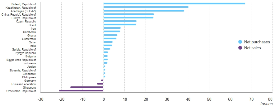Mezi hlavní kupce patřily centrální banky Kazachstánu (+18 tun na celkových 324 tun), Brazílie (+15 tun na 145 tun), Turecka (+7 tun na 641 tun) a Guatemaly (+6 tun na 13 tun). Česká národní banka během třetího čtvrtletí do svých rezerv přidala pět tun kovu. Za první tři čtvrtletí roku nejvíce kovu koupila polská centrální banka (+67,1 tuny).