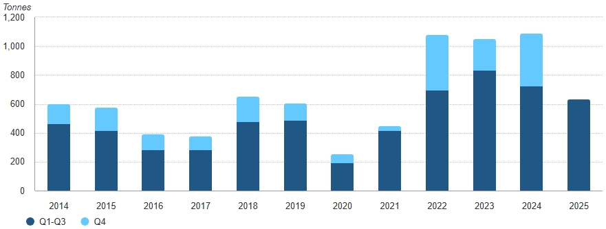 V technologickém odvětví byla poptávka mírně slabší, meziročně klesla o 2 % na 81,7 tuny. Snížil se přitom zájem výrobců elektřiny (-1 % na 68,5 tuny), po kovu pro využití v zubním lékařství (-7 % na 2 tuny) i po surovině pro ostatní průmyslové využití (-5 % na 11,1 tuny). Pokles poptávky v tomto segmentu je podle rady překvapivý, protože třetí čtvrtletí tradičně bývá silné díky uvádění nové elektroniky na trh před blížící se vánoční sezónou. Letošní anomálie podle ní může být daná předzásobením se výrobců během prvního pololetí v obavách z cel a jiných bariér v mezinárodním obchodě.