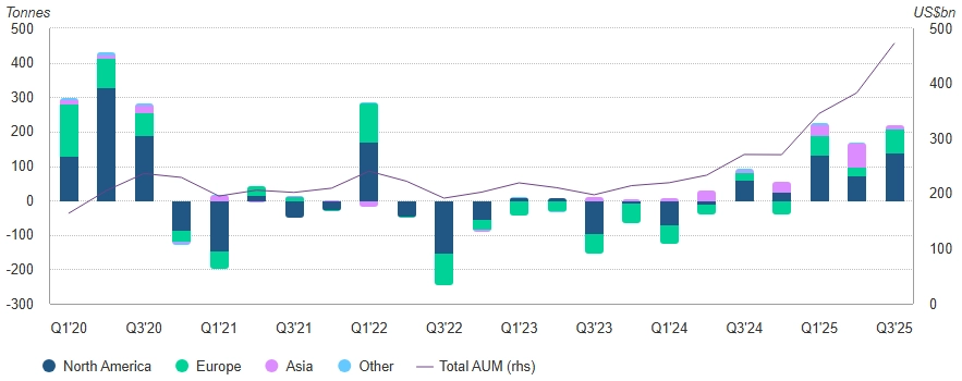 Nákup zlatých mincí a slitků stoupl o 17 % na 315,5 tuny. Tento nárůst ale nebyl ničím proti růstu zájmu o burzovně obchodované fondy (ETF) investující do zlata. Ty musely za nové peníze investorů přikoupit 221,7 tuny kovu (+134 %) v rekordní hodnotě 26 miliard dolarů (předchozí maximum z druhého čtvrtletí 2020 bylo 24 miliard). Severoamerické ETF ve čtvrtletí koupily zhruba 139 tun kovu, evropské 70 tun a asijské 13 tun.