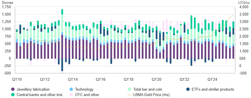 Spolu s cenou zlata ve třetím čtvrtletí rostla i poptávka po kovu. Celkem meziročně stoupla o 3 % na více než 1 300 tun. Vývoj zájmu byl ale rozdílný napříč segmenty trhu, upozorňuje Světová rada pro zlato. Někde byly vyšší ceny na obtíž, jinde to byl paradoxně spíše důvodem k intenzivnějším nákupům.