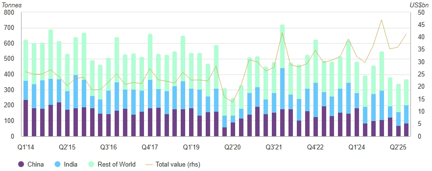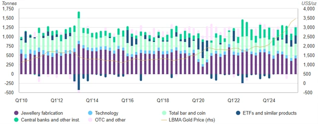 Indie a Čína podle rady představují velký potenciál na trhu se zlatými slitky a mincemi. Vyhlídky poptávky v technologickém sektoru jsou víceméně neutrální kvůli rozdílným očekáváním u výroby spotřební elektroniky a čipů pro AI infrastrukturu a centrální banky pak i v posledních třech měsících podle rady zůstanou čistými kupci kovu, byť celková poptávka z jejich strany zůstane pod loňskými 1 045 tunami.