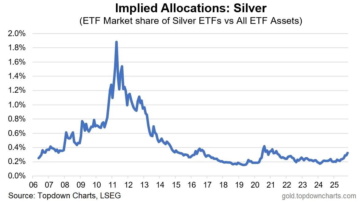 Alokace drobných investorů zůstávají i v případě stříbrných ETF ve srovnání s minulostí nízké, ale postupně rostou. Podobně jako v případě fondů zaměřených na zlato může i na trhu s těmi "stříbrnými" poptávka růst, a to do větší míry i díky makroekonomickým faktorům.