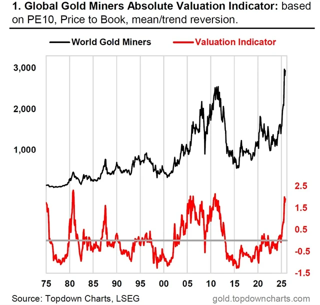 Po téměř ztrojnásobení cen akcií producentů zlata od 2022 se nabízí otázka, zda už optimismus ohledně vývoje ceny kovu není dostatečně zahrnutý i v kurzech akcií těžařů. Vysoké valuace mohou být postupně ospravedlňovány vyššími zisky těchto firem, je ale zásadní, aby cena samotného kovu zůstala vysoká, ideálně aby dále rostla. Proto i v tomto případě je výhled spíše neutrální než vyloženě optimistický.