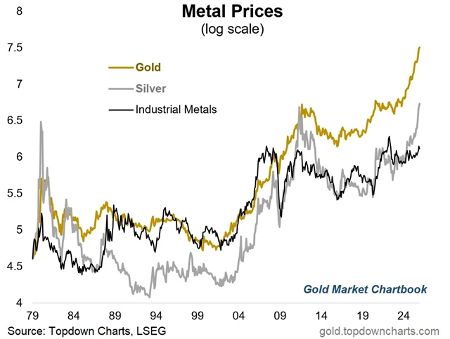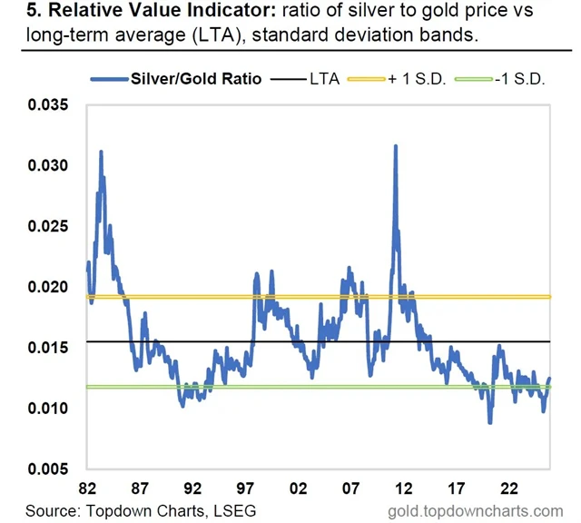 Relativně vůči zlatu začíná být stříbro opět silnější, po letech podvýkonnosti má ale opravdu co dohánět. Pokud se v příštích letech podaří zrychlit růst globální ekonomiky, pro stříbro a další průmyslové kovy to může být nový impulz.
