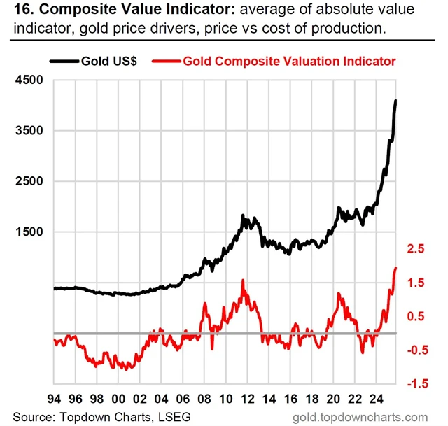 Callum Thomas z TOPDOWN CHARTS pro tyto účely sestavil velice užitečný indikátor. Ten kombinuje tři různé přístupy k určení toho, nakolik je zlato drahé: