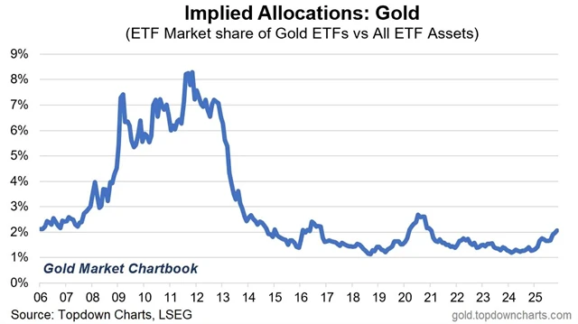Takzvaný retail se do býčího trendu na trhu se zlatem zapojil možná méně, než by se dalo čekat. Alokace peněz ve zlatých ETF je stále hluboko pod maximem z roku 2020, s maximy z konce růstového trendu po roce 2000 se pak vůbec nedají srovnávat. Teoreticky tak v této oblasti je prostor pro další růst, zdá se ale, že pozornost drobných investorů je silně napřena na sektor technologií a také na kryptoměny. Až jejich případná hlubší korekce může být spojena s větším zájmem o likvidní "papírové zlato".