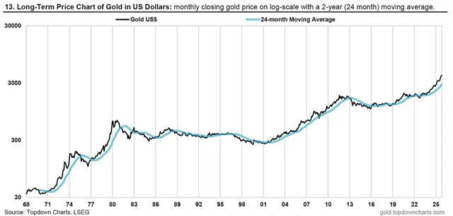 Cena zlata je sice pár procent pod říjnovým historickým rekordem, na dlouhodobém grafu je ale stále v růstovém trendu. Na měsíčním grafu je kurz stále výrazně nad 24měsíčním klouzavým průměrem. Současný růstový cyklus tak teoreticky stále může být teprve v ranější fázi, podobně jako to bylo během velkých růstových vln v 70. letech nebo v první dekádě třetího tisíciletí.