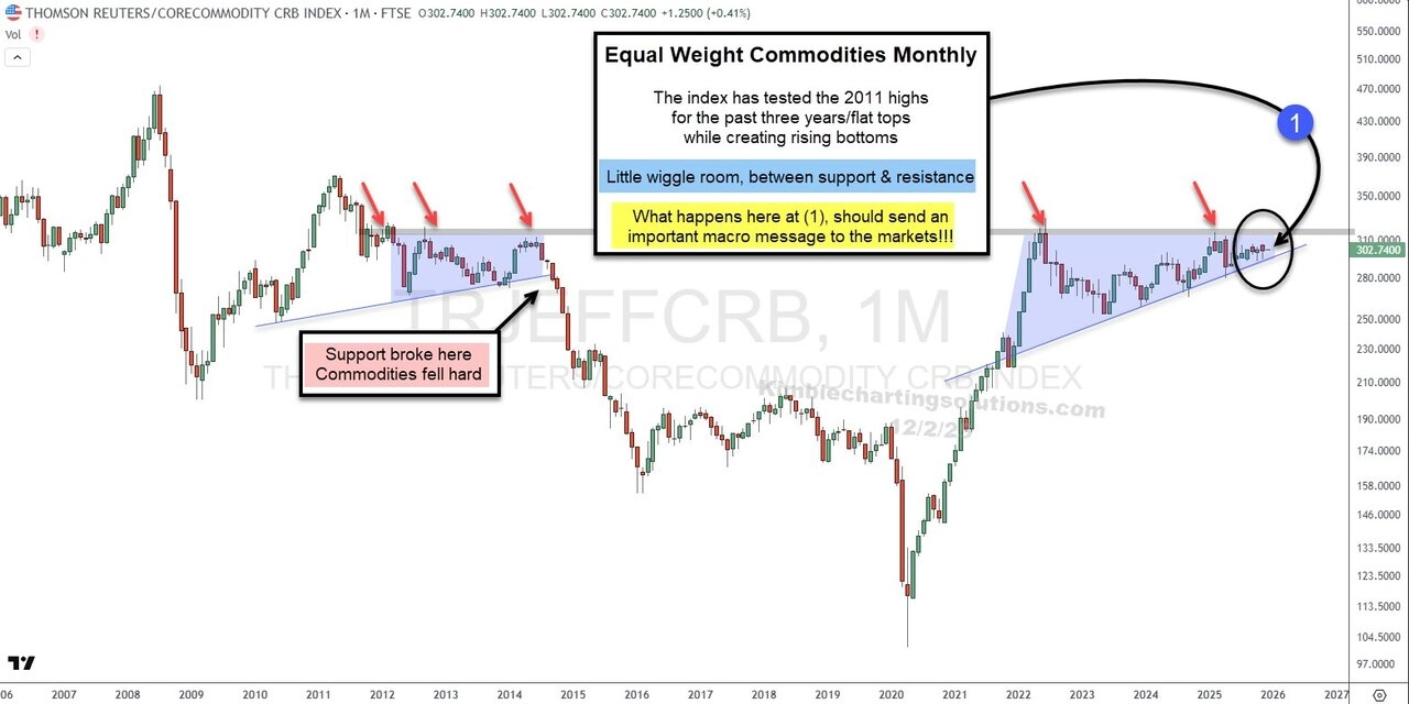 Ceny komodit (jde o "koš", kde mají všechny stejnou váhu) atakují maxima z roku 2011. Jde o úroveň, od které se index už několikrát odrazil níže. Na trh působí v současnosti několik protichůdných faktorů (například drahé zlato vs. relativně levná ropa), některé soft komodity pak podléhají svým sezónním nebo klimatickým (ne)pravidelnostem, které ovlivňují úrodu. Nicméně equal weighted varianta komoditního indexu je těsně pod mnohaletou rezistencí.