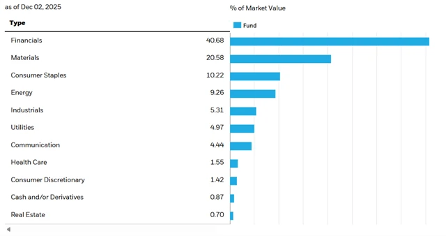 Tento ETF tak má celkem významnou expozici vůči komoditám, hlavně v těžbě surovin a energetice. A to znamená, že jeho cenový vývoj bude do určité míry ovlivněn cenami komodit. Jako proxy na komodity tento fond latinskoamerických akcií může dávat smysl, navíc díky silnému zastoupení financí a spotřebitelských firem je i "sázkou" na hospodářský růst v regionu jako takový.