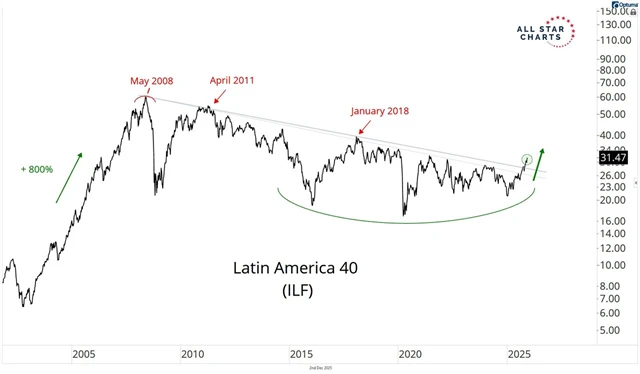 "ILF tento týden dosáhl čtyřletého maxima a v posledních týdnech proráží nad linii sestupného trendu, která platila od roku 2008, tedy od konce poslední masivní růstové fáze komoditního cyklu," říká nezávislý analytik Ricardo Sarraf. "Od začátku roku je fond bez započtení dividend o více než 50 % výše. Akcie mimo USA letos obecně překonávají americký trh, donedávna ale těžiště růstu bylo hlavně v Asii a Evropě. Latinská Amerika ale po letech útlumu získává na síle."