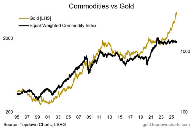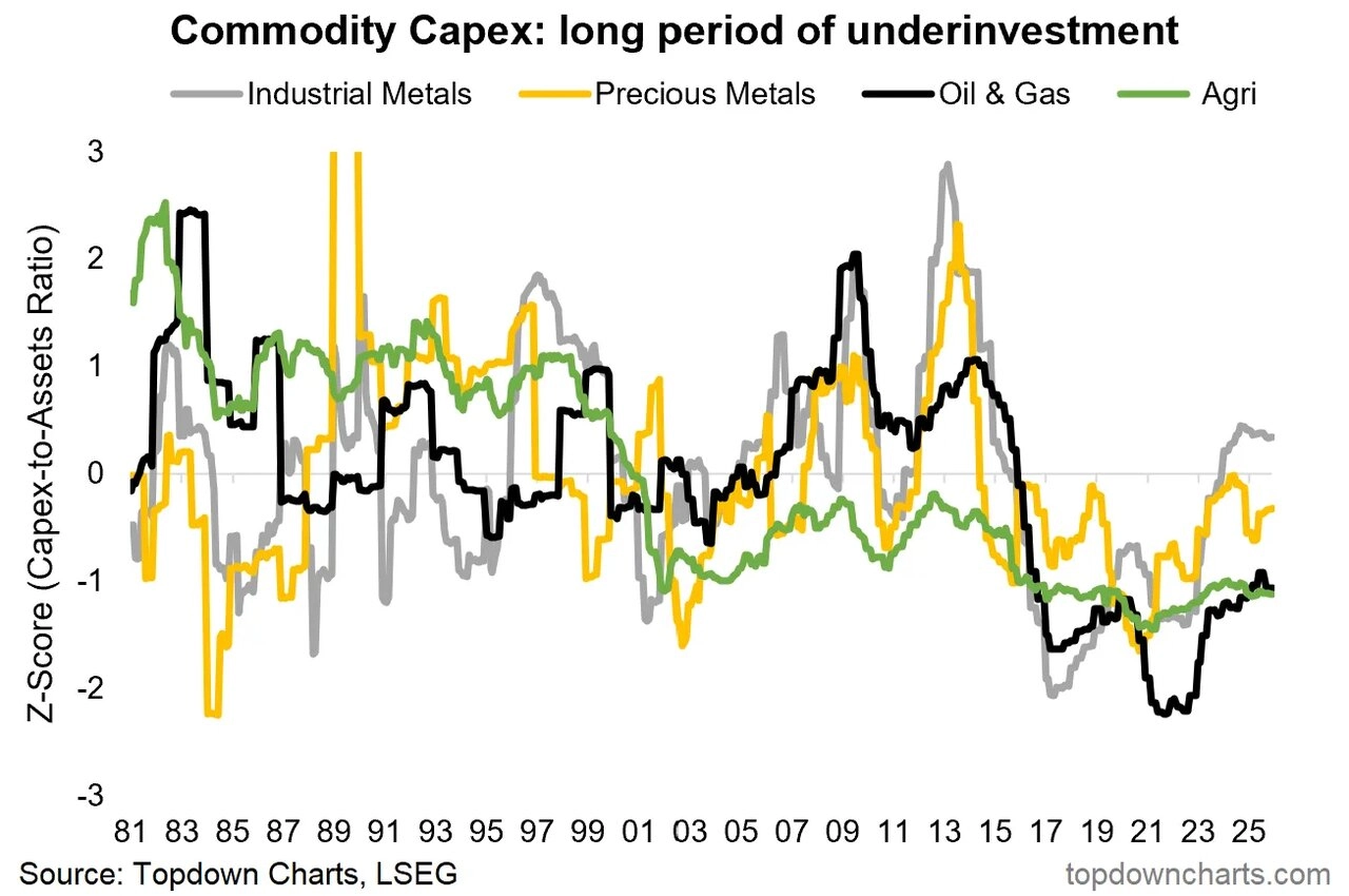 Komodity jako třída aktiv jsou navzdory cenovým rekordům zlata, stříbra a některých dalších z hlediska ocenění stále poměrně levné. Po letech slabé výkonnosti se rýsuje konec cyklického medvědího trendu z let 2022–2024 a začátek nového růstového cyklu. Nabídková strana je dlouhodobě podinvestovaná a poptávku čeká cyklické oživení. Trhu s komoditami navíc "chutná" slabý dolar a očekávané další uvolňování finančních podmínek.