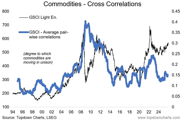 Ano, některé komodity (zejména zlato a stříbro) už zaznamenaly výjimečný růst cen, celý cyklus je ale pravděpodobně stále v rané fázi. Důkazem jsou nízké korelace ve vývoji cen jednotlivých komodit. Celé komoditní stádo se ještě nedalo do pohybu.