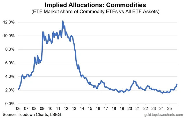 Na trhu jsou některé komodity, zejména drahé a některé průmyslové kovy, které jsou už opravdu hodně drahé. Nenechme se ale mýlit, obecnější sentiment investorů vůči téhle třídě investic zůstává spíše vlažný a alokace kapitálu do komodit zůstávají nízké. Přibývá přitom signálů, že se formuje nový cyklický býčí trend, který se může stát jedním z velkých příběhů začínajícího roku, a tedy i zajímavou investiční příležitostí.