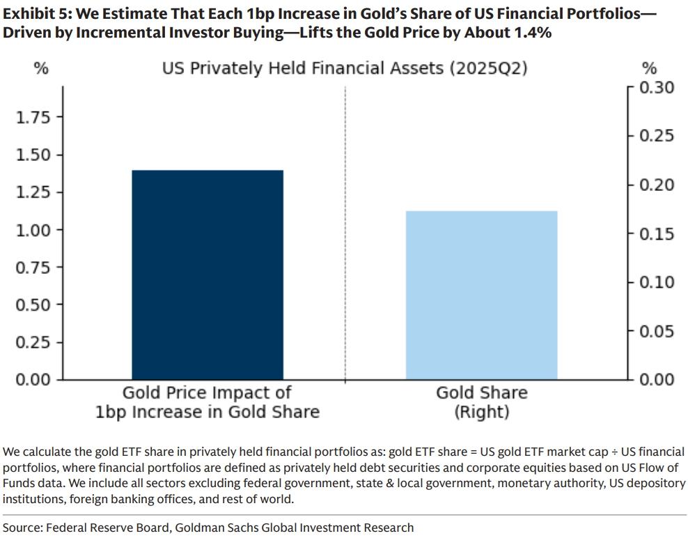 Pro Goldman Sachs je přitom zlato už delší dobu sázkou číslo jedna v rámci celého komoditního trhu. Analytici banky přitom vypočítali, že pokud by se soukromí investoři opravdu ve větším přidali k centrálním bankám, může cena žlutého kovu snadno překonat stanovený cíl. "Zlaté ETF v současnosti tvoří jen asi 0,17 % soukromých finančních portfolií v USA, tedy méně než na vrcholu v roce 2012. Každý nárůst tohoto podílu o pouhý jeden bazický bod by přitom mohl zvýšit cenu zlata o zhruba 1,4 %," stojí ve zprávě Goldman Sachs.