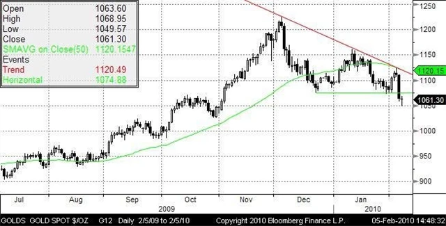 Technicky znamenalo prolomení dvojitého dna na úrovní 1 075 USD spuštění dalších prodejních příkazů. Prostor k poklesům je stále volný, a to až k úrovním na 1 026 USD a 1 022 USD. To jsou další hranice podpory, následuje hodnota 1 000 USD. Příčiny, které hnaly cenu na rekordní úrovně v roce 2009, jsou stále ve hře a jakmile by se obavy o státní dluhy změnily v krizi důvěry, zlato by bylo opět na výsluní.