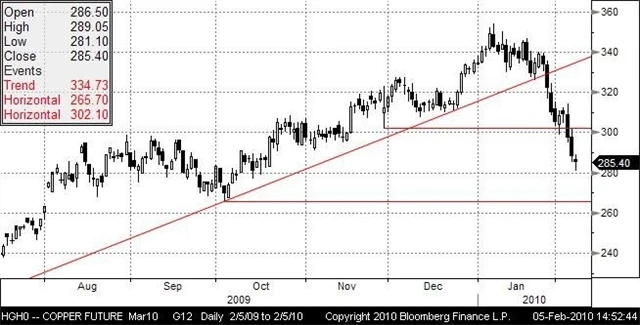 Meď High Grade, nejlepší kov v roce 2009, se také dostal pod cenou 300 USD do série technických prodejů. Nacházející svátky Nového lunárního roku v Číně spolu s posilujícím dolarem vyústily v korekci. Pro kontrakt s dodáním v březnu představuje podporu cena 265 a 250 dolarů.