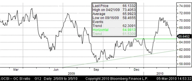 Poměr ceny zlata a stříbra se snížil ze 71 na 65,70. Stříbro překonalo zlato za minulý měsíc růstem o 7,5 %. Čekáme, že na poměru 65 nalezne tento ukazatel podporu a zlato začne opět překonávat stříbro. Z toho však spíše plyne možnost poklesu obou cen jako důsledek nedávného růstu.