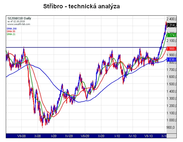 Cena stříbra se nachází v extrémně silném růstovém trendu, což ukazují všechny tři klouzavé průměry - krátkodobý 21denní (zelená křivka), střednědobý 55denní (červená křivka) i dlouhodobý 200denní (modrá křivka). Na počátku září byla proražena důležitá rezistence na 20 dolarech.