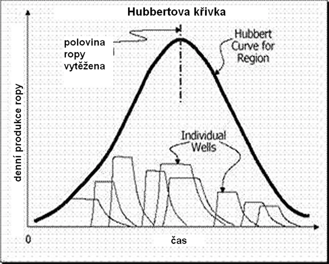Objem vytěžené ropy se podle této teorie pohybuje po tzv. Hubbertove křivce (M. King Hubert, zakladatel teorie ropného vrcholu - pozn. autora), která má zvonovitý tvar a ukazuje možný vývoj produkce ropy.