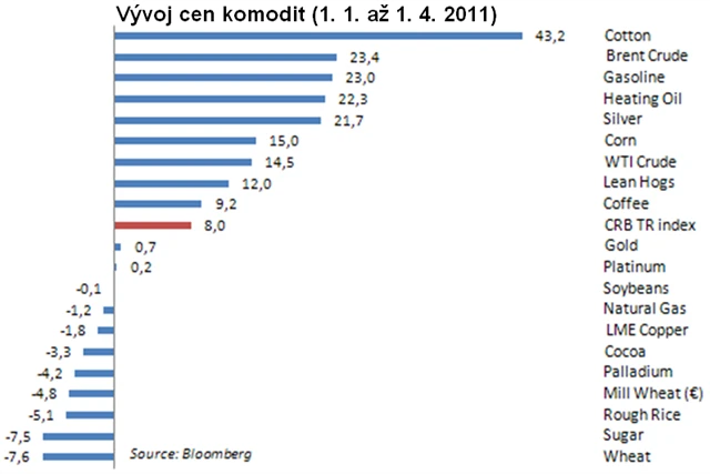 Komodity mají za sebou třetí ziskové čtvrtletí v řadě. Pomáhá jim geopolitické napětí, které plyne z nepokojů v severní Africe a na Blízkém Východě a které žene vzhůru ceny energetických komodit. Všechny tři hlavní komoditní indexy díky tomu překonaly za 1. čtvrtletí výkon akciového indexu MSCI World, který za první kvartál přidal 4,3 %. Nejvíce rostl index S&P GSCI, který si díky silnému zastoupení energetického sektoru připsal 11,6 %. Index DJ USB, který je mezi různé komodity rozložen rovnoměrně, přidal 4,4 %. Mezi nimi se nachází, měřeno růstem, index Reuters Jefferies CRB, který si za první čtvrtletí připsal 8 %.
