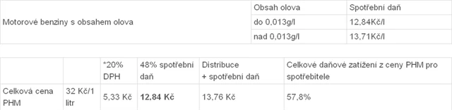 Pro výpočet podílu daní na cenách pohonných hmot vycházíme z aktuálních údajů o spotřební dani: