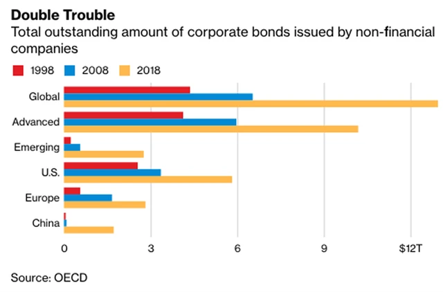Globální firemní dluh se od roku 2008 vyšplhal na 13 bilionů dolarů, což s sebou nese zvýšenou míru rizika a zranitelnosti, varuje v aktuální zprávě OECD. Dodává, že některé společnosti mohou mít napříště v důsledku zpomalení ekonomiky problém s plněním svých závazků. To by znamenalo nižší investiční aktivitu a vyšší míru defaultů, což by následně přibrzdilo ekonomiku. Rotace ve spirále smrti by se tím jen zrychlila.