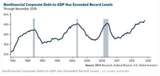 K nezřízenému půjčování (a nárůstu s tím souvisejícího rizika) v poslední dekádě docházelo jak na rozvíjejících se trzích, tak na těch nejvyspělejších. Amerika se nyní potýká s korporátním dluhem dosahujícím úrovně bezmála poloviny HDP země. Něco podobného, respektive vyšší poměr dluhu vůči HDP, přitom v posledních čtyřiceti letech opakovaně a spolehlivě signalizovalo recesi. A ta se podle některých prominentních tržních hlasů opět blíží.