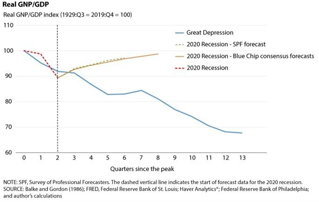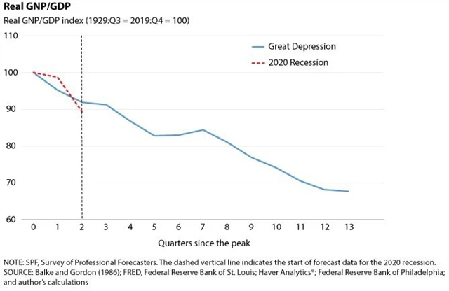 Pokud srovnáme data o aktuálním vývoji hrubého domácího produktu a historické údaje o vývoji hrubého národního produktu, které pokrývají i období takzvané velké deprese, spatříme toto.
