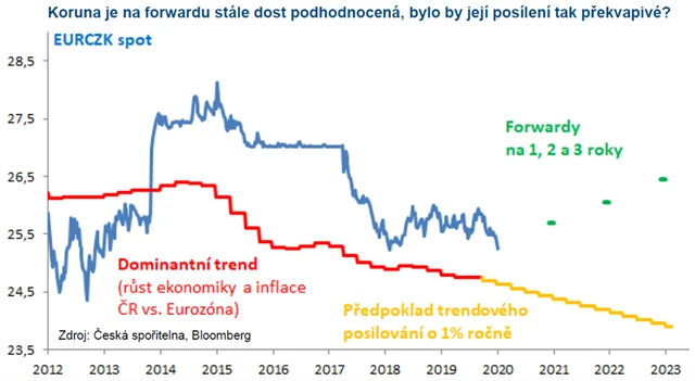 Oproti rizikům globální hospodářské recese stojí to, zda je koruna drahá, či naopak levná (valuace), a za jaký kurz ji lze v budoucnu prodat (forward). Koruna v páru s eurem strávila dva roky v pohybu "do strany" a je stále mírně podhodnocená vůči dominantnímu trendu (rychlejší růst české ekonomiky než HDP eurozóny, korigovaný o rozdíl v inflaci).