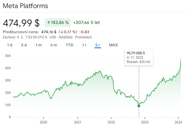 Za posledních 5 let vzrostla cena akcií Meta o téměř 184 %, z lokálního minima v listopadu 2022 si cenné papíry připisují přes 420 %.