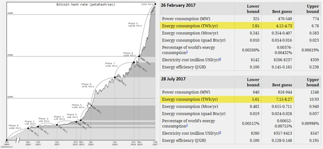 Ohledně energetické náročnosti těžby bitcoinu se dlouhodobě vedou velké spory. Podle serveru BitcoinEnergyConsumption spotřebuje za rok těžba bitcoinu téměř 30 TWh energie. Etický hacker a odborník na počítačovou bezpečnost Marc Bevand však tvrdí, že to ke konci července byla jen asi čtvrtina. Pokud Bevandův odhad zvýšíme o 45 % (energetická náročnost těžby podle jeho výpočtů v poslední době každý měsíc roste o asi 15 %), dostaneme se k začátku listopadu na anualizovaných 11,2 TWh, tedy jen přibližně třetinu odhadu serveru BitcoinEnergyConsumption.