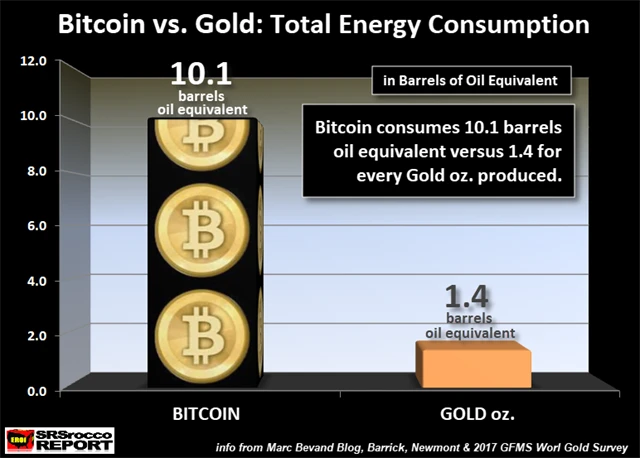 Těžba jedné unce zlata podle údajů společností Barrick Gold a Newmont Mining vyšla loni na zhruba 8,5 gigajoulu. Převedeme-li čísla týkající se zlata a bitcoinu na společnou jednotku, činila loni energetická náročnost těžby jedné unce zlata 1,4 barelu ropného ekvivalentu, zatímco náročnost těžby jednoho bitcoinu dosahuje 10,1 barelu ropného ekvivalentu. Celkem tak loni byla při těžbě zlata spotřebována energie v objemu 123,2 milionu barelů ropného ekvivalentu, anualizovaná spotřeba energie pro těžbu bitcoinu podle aktuálních čísel činí asi 6,6 milionu barelů ropného ekvivalentu.