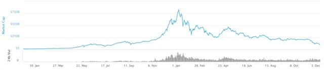 Celkově letos trh s kryptoměnami v porovnání s vrcholem z ledna, kdy celková tržní kapitalizace kryptoměn byla přes 830 miliard USD, ztratil podle údajů portálu coinmarketcap.com 87,09 %. Intradenní obchody se od té doby snížily o 61,65 %. Je přitom otázkou, jaký psychologický efekt bude mít případný pokles market capu trhu pod 100 miliard USD.
