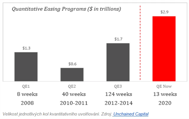 Kvantitativní uvolňování je dobrým příkladem postupné eroze definic a záruk ohledně kvality státních peněz. Stejně jako vladaři v antickém Římě nejsou ani současní centrální bankéři schopni dlouhodobě udržet peníze nezlehčené. Kvantitativní uvolňování mělo být v roce 2008 jednorázovým programem v objemu 600 miliard dolarů. Tento slib byl porušen (objem odkupů byl nakonec dvojnásobný) a následovala další kola přímých nákupů cenných papírů ze strany mnoha centrálních bank. Letošní vlna kvantitativního uvolňování je svou mohutností bezprecedentní. Hlavním nakupovaným cenným papírem jsou samozřejmě státní dluhopisy, přičemž je nenakupuje pouze Fed, ale všechny významné centrální banky světa. V principu se jedná o poskytování neomezených prostředků vládě; prostředků, které jsou nově vytvořeny a jejichž kupní síla se odvíjí od adekvátního úbytku kupní síly ostatních držitelů.