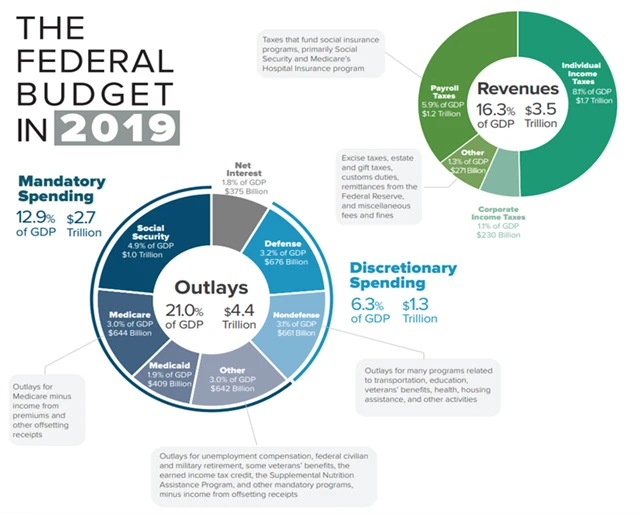 V grafice jsou pro nás podstatné pouze dva údaje – celková výše příjmů a celková výše výdajů. Zatímco příjmy činí 3,5 bilionu dolarů, výdaje jsou 4,4 bilionu. Vláda si musí na čtvrtinu svých výdajů půjčit, a to prakticky každý rok (za posledních 50 let byl pouze 5 let rozpočet v přebytku). Nenechme se zmást tím, že jsou jak v této grafice, tak v médiích státní příjmy a výdaje vztahovány k HDP, to je irelevantní. Relevantní jsou příjmy a výdaje dané entity – v rámci bytového domu také nevztahujete příjmy a výdaje své domácnosti k "produktu" celého domu, nýbrž k produktu své domácnosti.