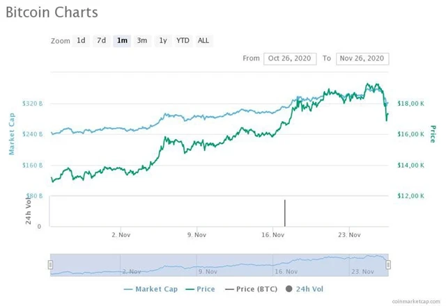 Vzhledem k tomu, že historické maximum bitcoinu je velmi silnou úrovní rezistence, lze současný propad kurzů kryptoměn považovat zřejmě jen za vybírání zisků po silné rally. Další dny by měly napovědět, zda bude znovu testován rekord pod 20 000 USD.