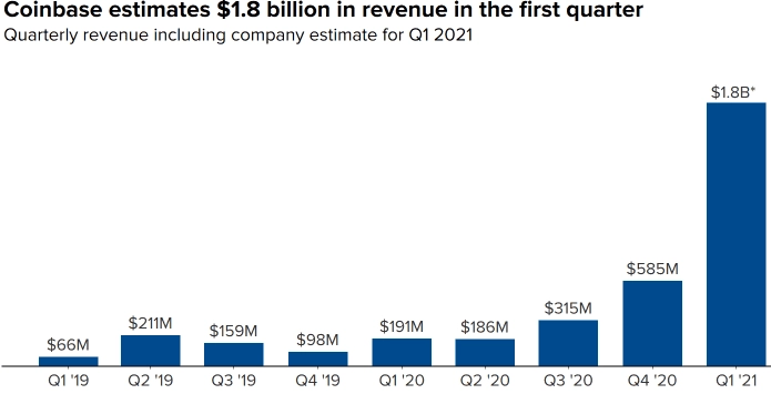 Coinbase, založená v roce 2012, je největší burzou kryptoměn ve Spojených státech. Letos zaznamenala nárůst výnosů díky vzestupu hodnoty bitcoinu a dalších kryptoměn. V prvním čtvrtletí tohoto roku odhaduje výnosy na 1,8 miliardy dolarů, což je devětkrát víc než před rokem.