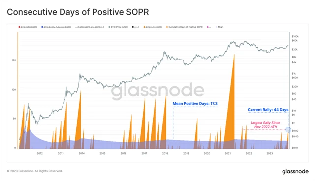 Podle údajů společnosti Glassnode se index SOPR, který sleduje průměrné výnosy investorů během rallye bitcoinu, udržel na velmi vysokých úrovních téměř 50 dní, což je déle než průměrná doba trvání 17 dní (nejdelší období od cenového maxima v listopadu 2021). To na jedné straně znamenalo, že drtivá většina investorů vybírala zisky, a na druhé straně po mnoho týdnů docházelo k přílivu poptávky, která pohlcovala nabídku.